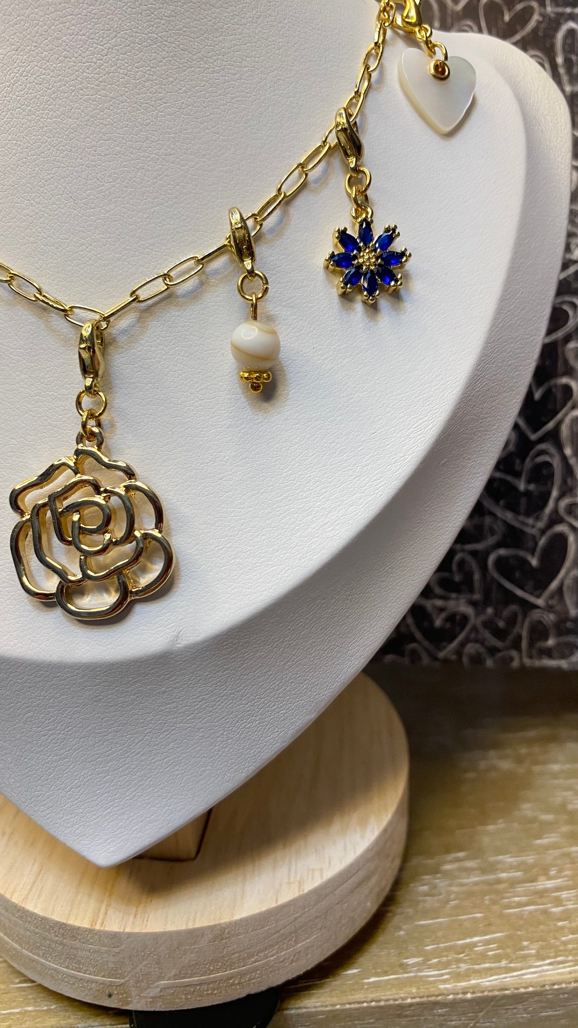 This 22-inch gold-plated stainless steel chain is adorned with charms crafted from Swarovski crystals, crystal, and glass beads. Each charm is connected with a tiny lobster claw, allowing you to easily rearrange them for a personalized style. Discover a fresh way to design your own charm necklace by watching the full video, then visit the main page to try the "New Interactive Custom Charm Necklace Designer." It’s an exciting and enjoyable way to create jewelry that’s truly yours.