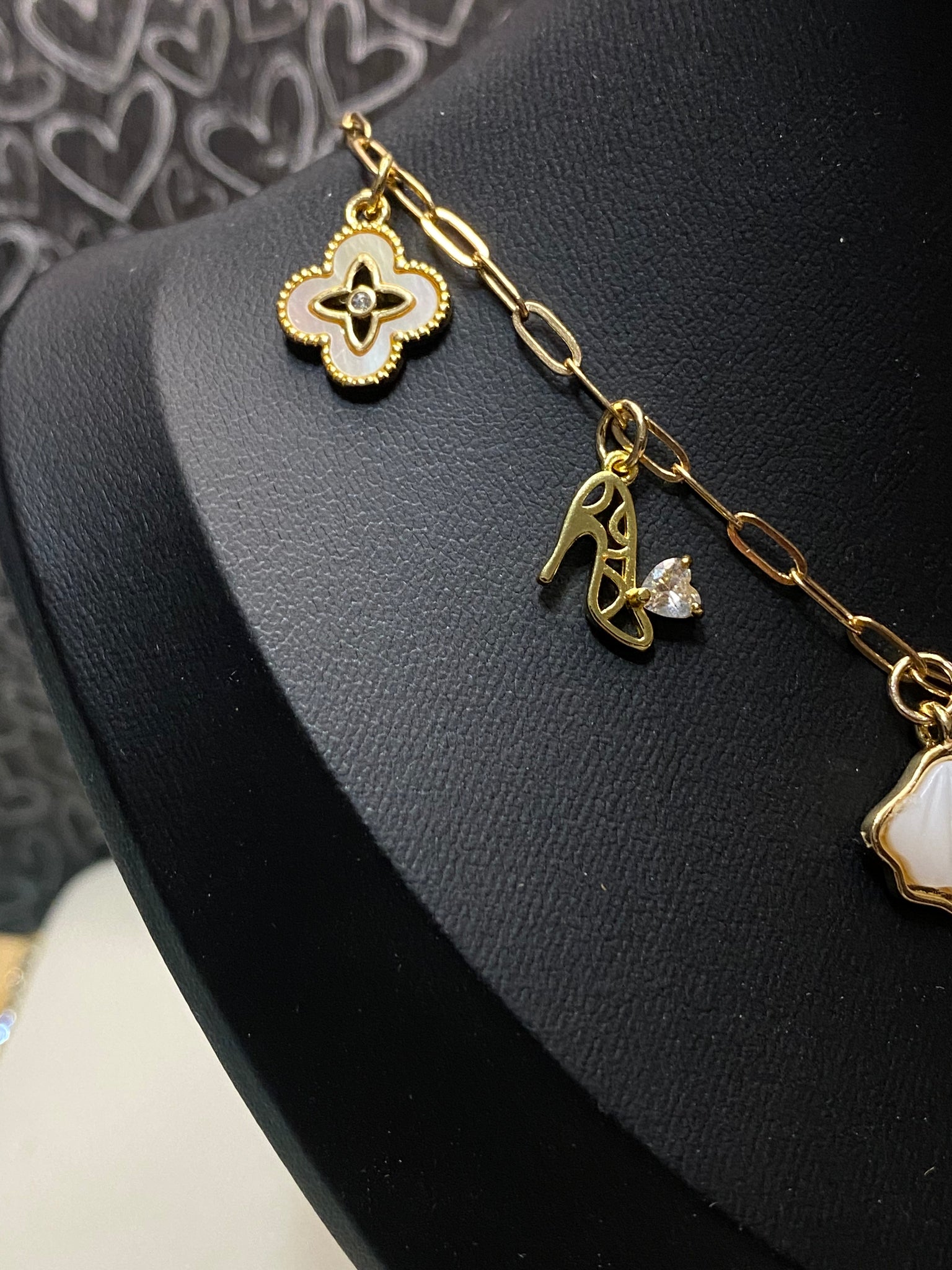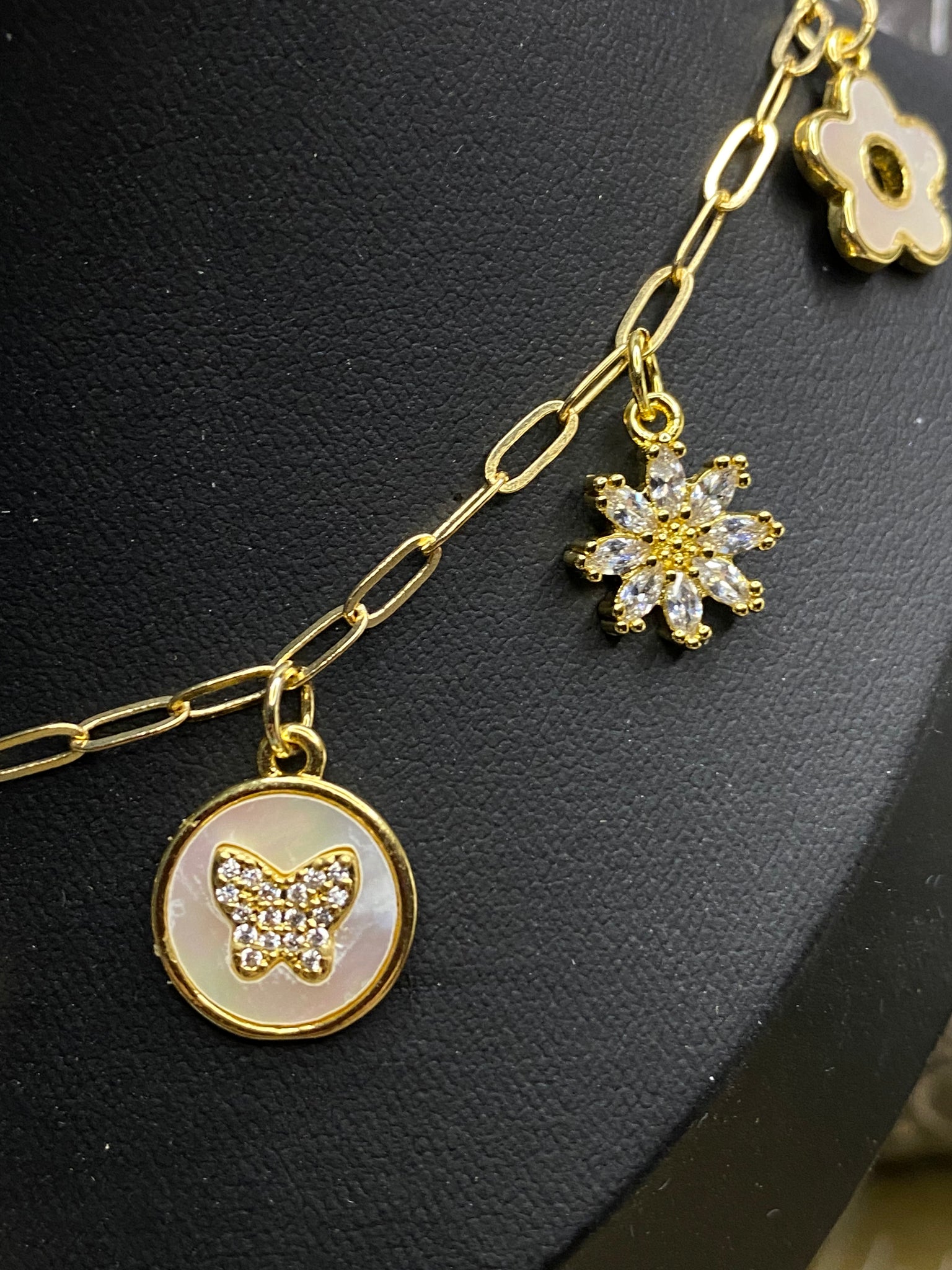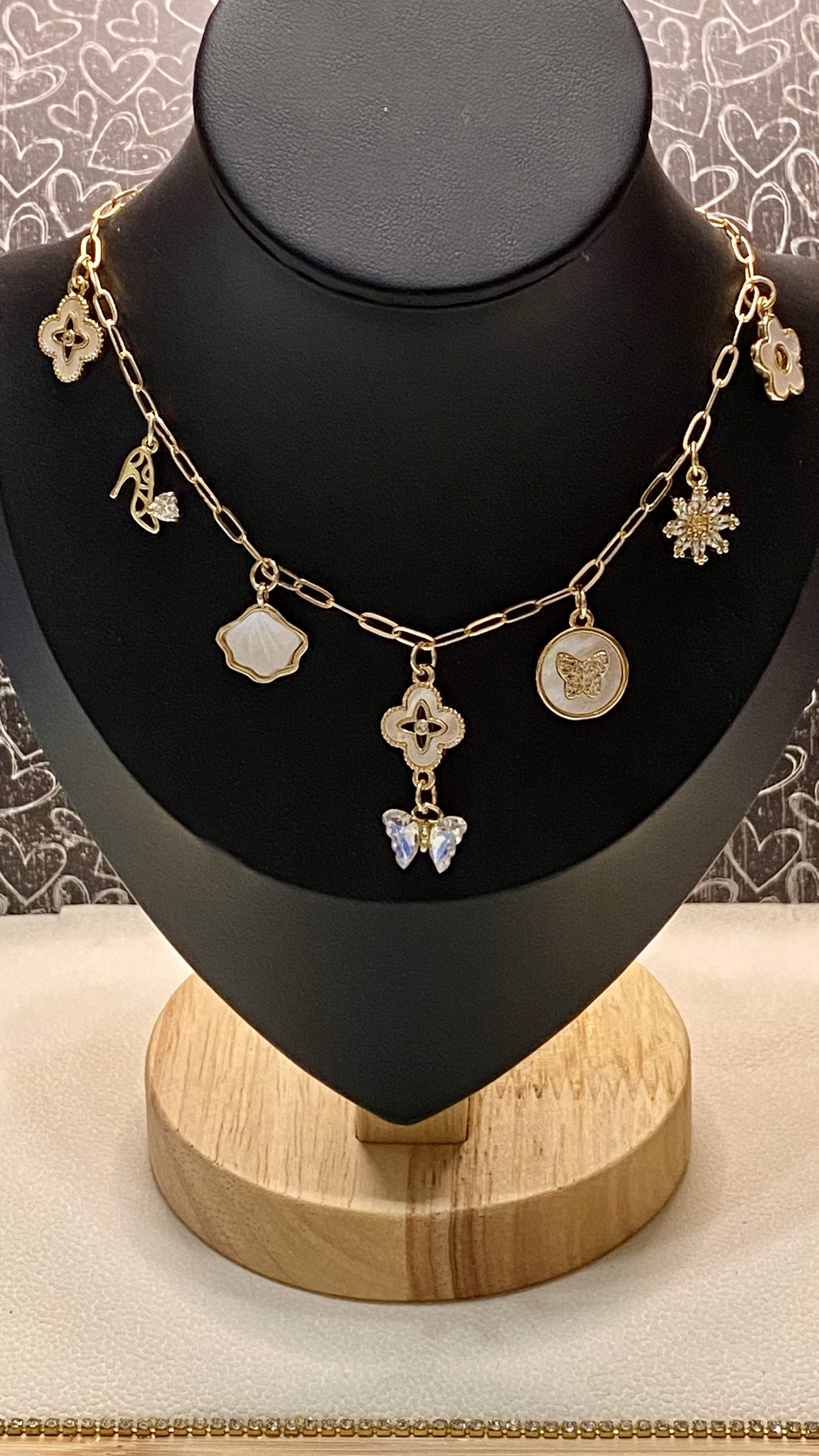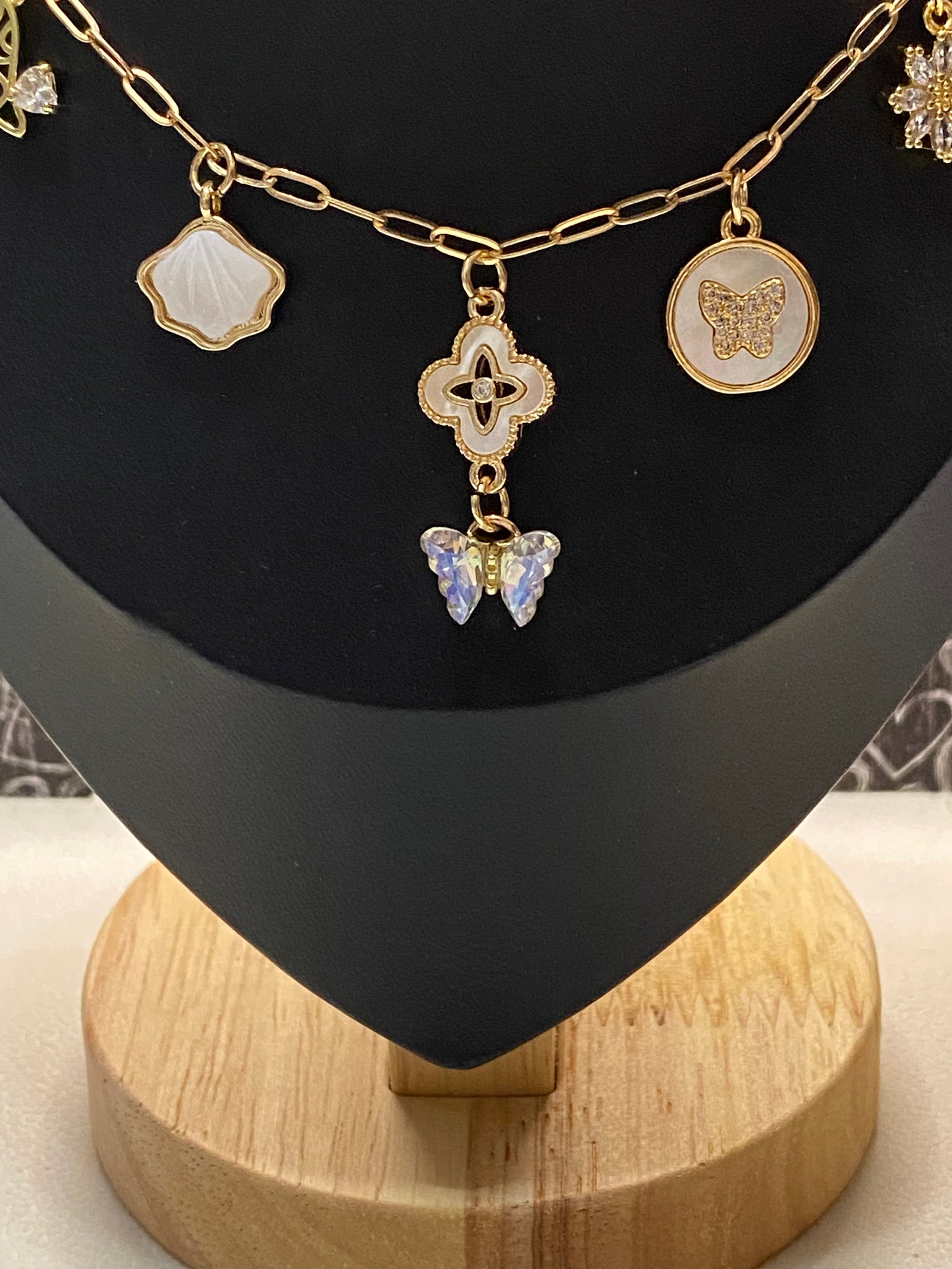 Elevate your style with this exquisite charm necklace crafted from gold-plated , featuring dazzling crystal butterfly and authentic shell charms for a sophisticated, eye-catching look.